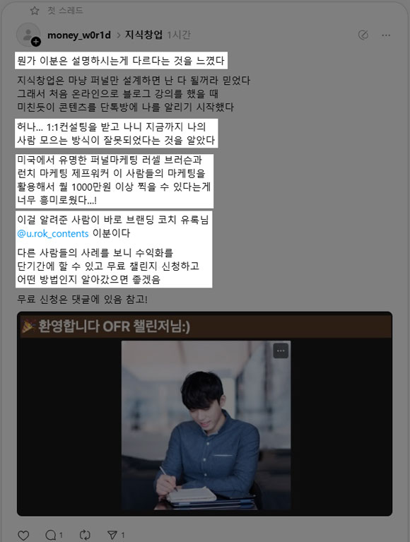 다만, 만약 이번에 떨어지셨다면 다음 기회에는 신청서 질문에 조금 더 자세하게 적어주시기를 바랍니다. 하지만 자세하게 적어주셨다고 해도 온라인 강의 비즈니스 적합자가 아니라면 죄송하지만 OFR 챌린지에는 참여할 수 없습니다.