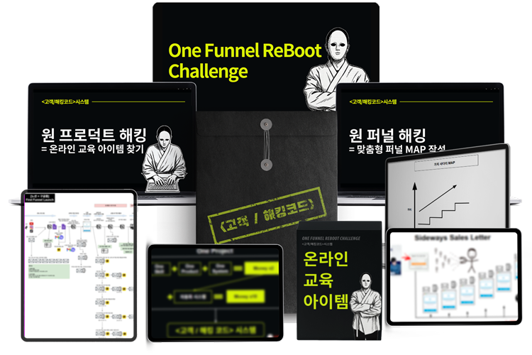 지금 'One Funnel Reboot Challenge'에 참여하면, 무료로 이 챌린지를 받을 수 있습니다. 하지만 예고 없이 해당 챌린지는 유료 챌린지로 바뀔 예정입니다. 왜냐하면 해당 챌린지에는 30만 원 상당의 1:1 라이브 코칭을 통해 맞춤형 '온라인 교육 프로그램 + 맞춤형 퍼널 + 가치사다리' 설계를 돕습니다. 이로인해 당신은 즉시 론칭을 통해 수익화에 성공할 70%의 준비를 끝낼 수 있게 됩니다.