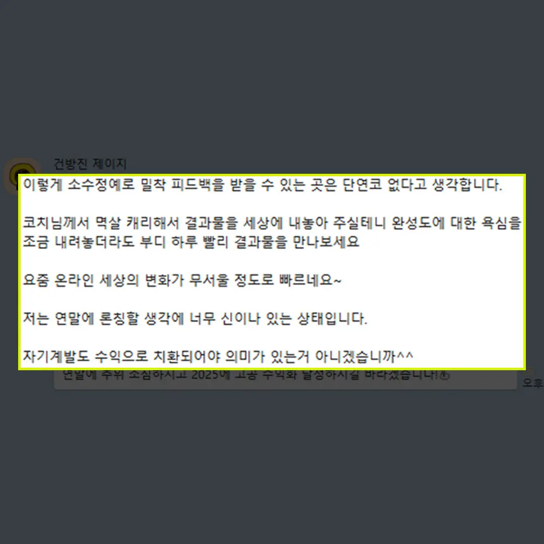 저는 직접 피드백과 아이디어를 제공합니다. 그러다보니 열심히 하는 수강생은 빠르게 매출을 높이고 있습니다.